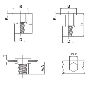 | Thread | Grip Range (E) | A | Hole (+0.1) | D (+0.07 -0.1) | B (±0.3) | K(±0.15) | L(±0.3) | Close End | |