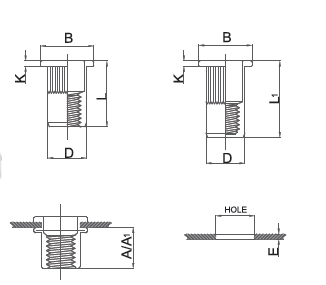 | Thread | Grip Range (E) | A | Hole (+0.1) | D (+0.07 -0.1) | B (±0.3) | K(±0.15) | L(±0.3) | Close End | |
